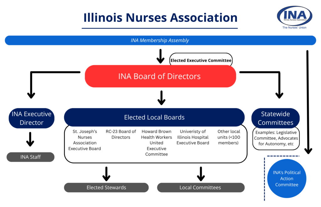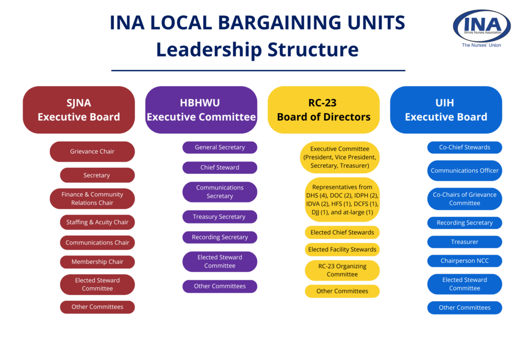 Each local bargaining unit also has their own elected leadership that must adhere to their local bylaws, as well as the bylaws of the INA. Units also have stewards and committees that ensure members’ interests are being represented in their workplaces and in union decision-making.